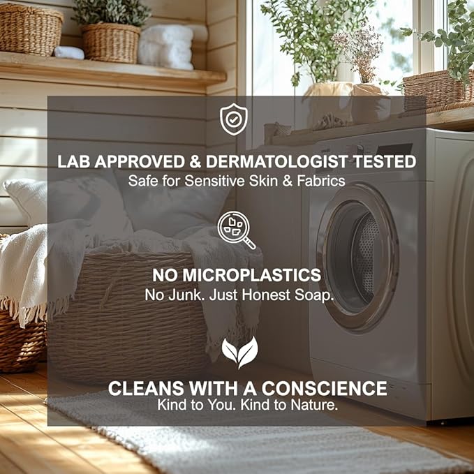 - ✔ HYPOALLERGENIC & GENTLE ON SKIN Made with hypoallergenic ground bar soap and no harsh chemicals — safe for sensitive skin and delicate fabrics.