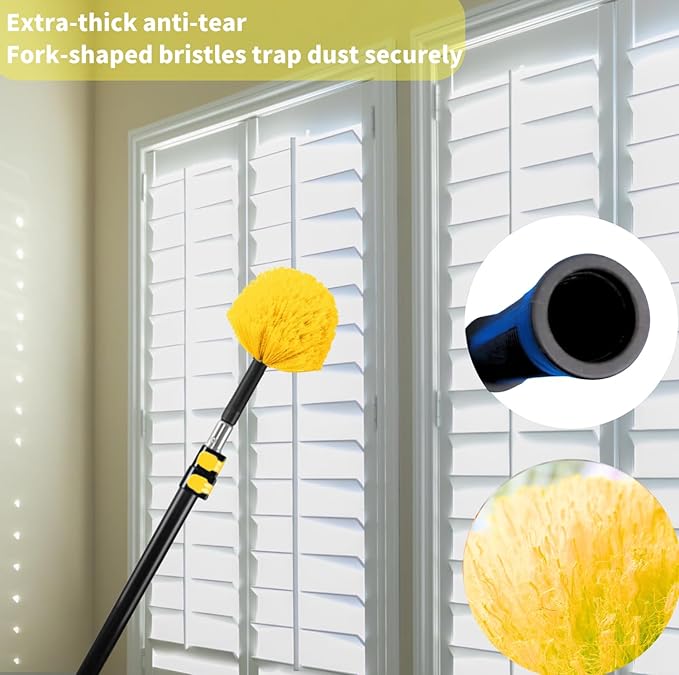 - SAY BYE TO COBWEBS & DUST: The duster head is made of microfiber, It becomes electrostatically charged as you use it, easy to attracting dust, pollen and hairs, The fluffy microfiber and the soft rubber on the top guarantees no scratches to the surface of furniture or wall during cleaning.