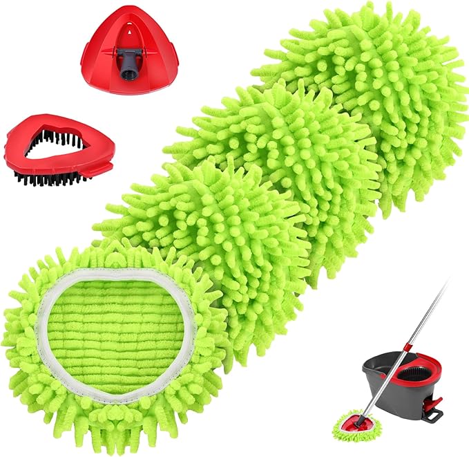Chenille Mop Heads Replacements 4 Pcs &1 Brush Head & 1 Base Set for Ocedar Easywring 1-Tank System,Reusable Microfiber Spin Mop Replacement Head for Floor Cleaning and Tile