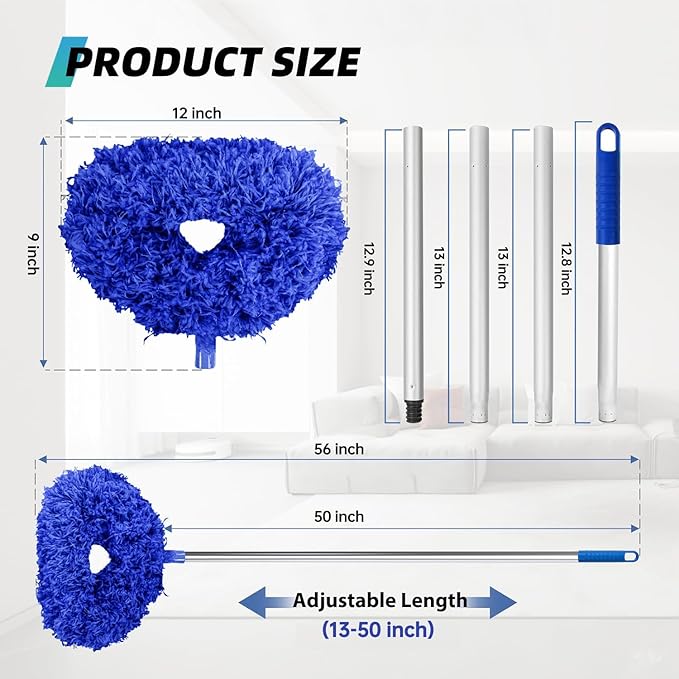 - [Adjustable Length] The ceiling fan cleaner is a four segment splicing product that can be freely adjusted in length. The extension pole can be adjusted to 13 to 50 inches, making it convenient to clean both low areas and high ceilings.
