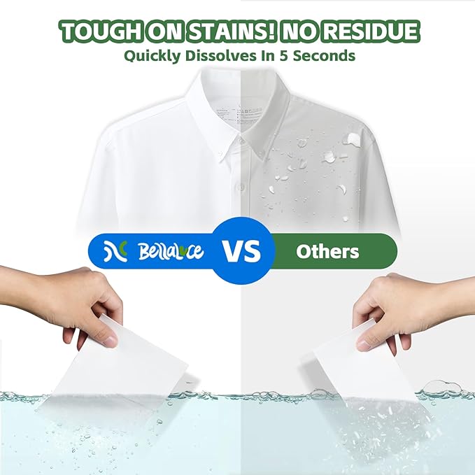 - POWERFUL CLEANING & QUICK DISSOLVE - Experience superior stain removal with our laundry detergent sheets that dissolve instantly in any water temperature. Formulated to tackle tough stains like grease, coffee, and sweat while releasing a fresh and clean scent - all while being gentle on fabrics and skin.