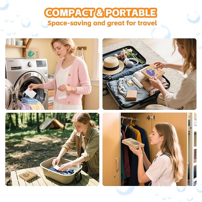 - 【SPACE-SAVING & PORTABLE】Saves time and space with our compact laundry detergent sheets. Each sheet is packed with cleaning power, eliminating the need for bulky bottles or jugs. Whether you're traveling or simply looking to declutter your laundry room, our detergent sheets are the convenient solution you've been looking for.