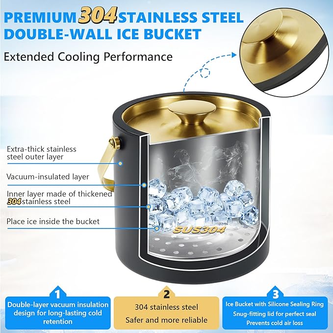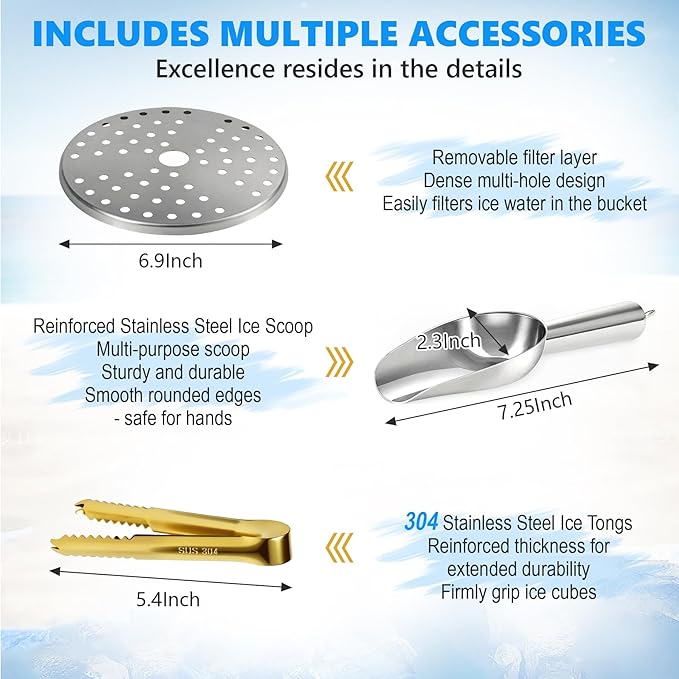 - 【MULTIPLE ACCESSORIES】Everything you need for chilling,ice bucket comes with an ice scoop,Ice Tongs,Removable filter layer,and even the Rapid-Freeze Whiskey Stones as you choose.