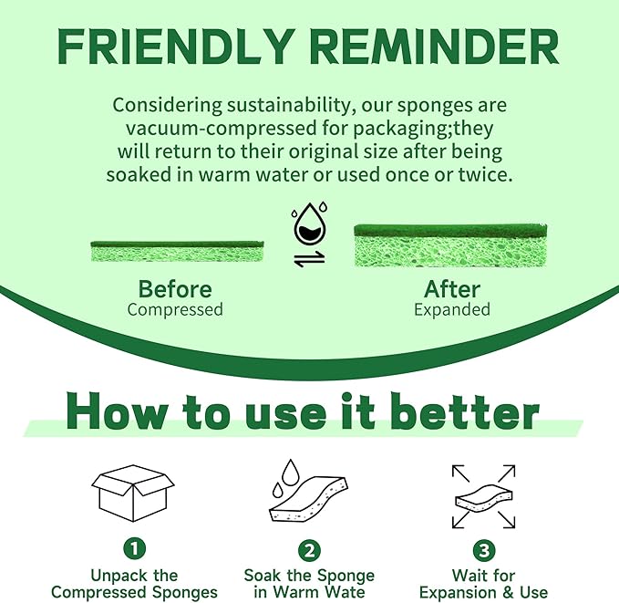 - Easy to Dry and Reusable:Crafted from sustainable materials, these kitchen sponges rinse clean and dry quickly to prevent odors. It is recommended to replace it regularly to ensure the effective cleaning.