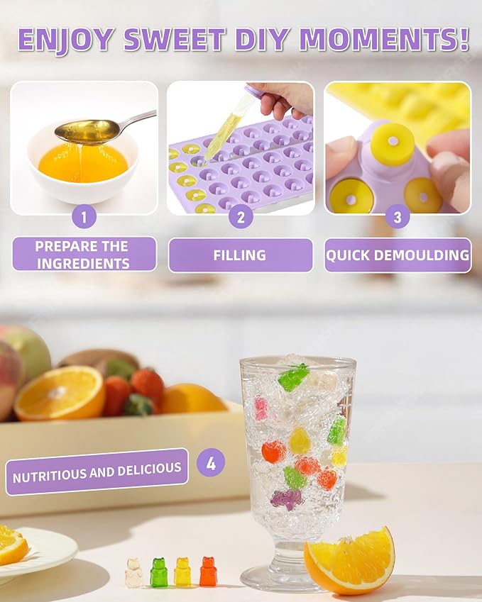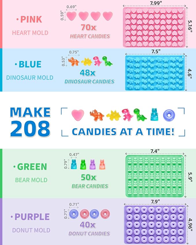 - 4 SHAPES CANDY MAKING SET: The gummy molds includes bears, dinosaurs, donuts, hearts. Comes with 2 droppers of 5ml and 1 clean brush. Whether it's a birthday party, a holiday celebration, or just a fun family activity, the diverse shapes inspire limitless creativity.