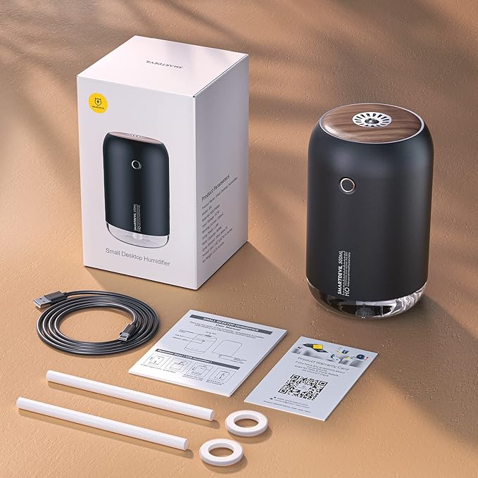SmartDevil Portable Mini Humidifier, 500ml Desk Plant Humidifier, USB Personal for Bedroom, Office with Night Light, 2 Mist Modes, Black