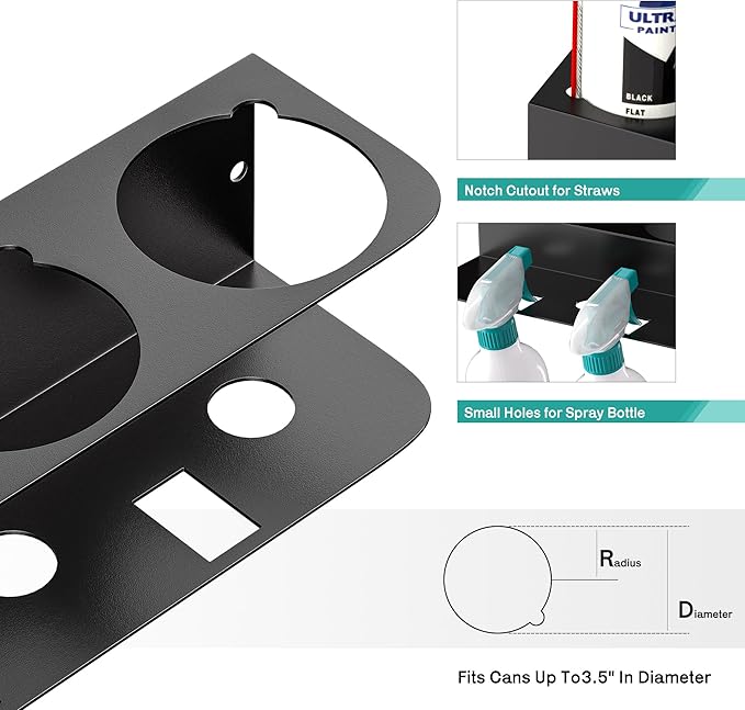 - SIZE AND COMPATIBILITY: This paint can organizer accommodates various spray bottles and cans (up to 3.5 inches in diameter), including paint cans, cleaners, and lubricant bottles. It is designed to fit perfectly with 16-inch stud spacing