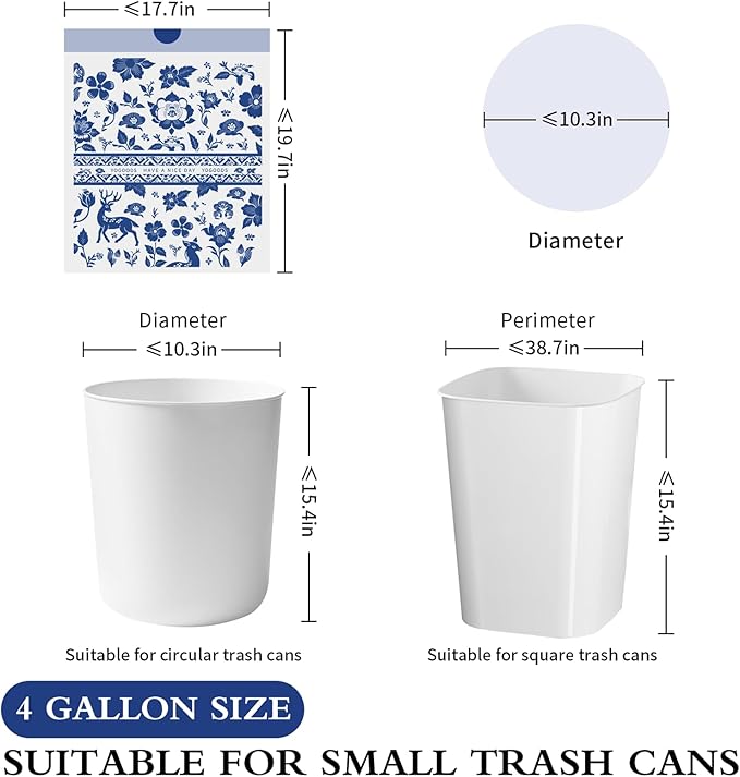 - đ¸ăVibrant Printed Design for Daily DelightăUpgrade your trash routine with stylish 4 gallon trash bags! Unlike plain garbage bags, our decorative small trash can bags feature floral/geometric patterns to brighten your bathroom, kitchen, or office bins. Perfect for users who value both beauty and practicality in small trash bags 4 gallon.