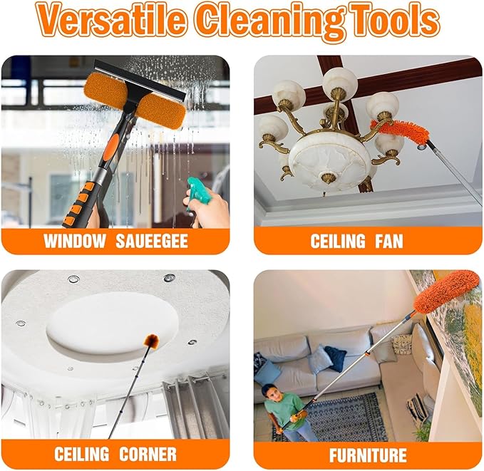 - Universal Joint, Compatible with Various Cleaning Accessories: The universal joint on the pole can connect a variety of dusters for cleaning heads and other cleaning accessories, such as window squeegee, cobweb duster, light bulb changers, and more. This transforms the pole into a versatile ceiling fan cleaner duster set, enabling you to use it for multiple cleaning tasks. Use this extendable duster to keep dirt and stains at bay.