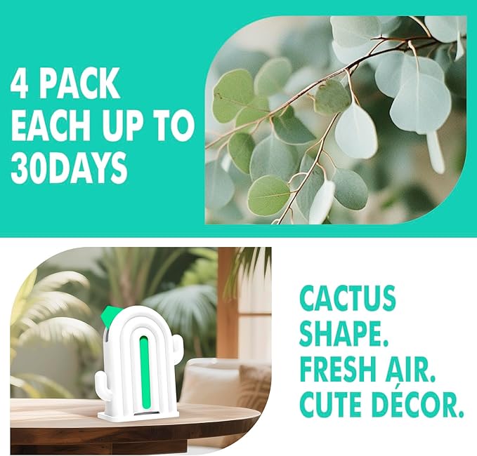 Air Freshener for Home, 2 Pack, 2 Refill, Eucalyptus Scent, Odor Eliminator, Up to 120 Days, Cactus-shaped Freshener for Closet Bathroom, Cute Home Decor, White