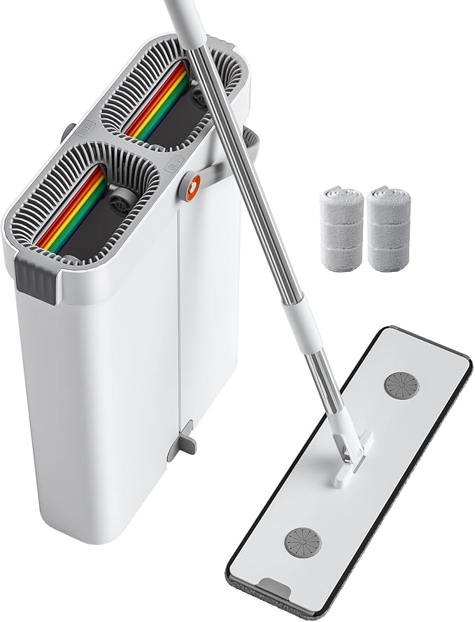JOYBOS Mop and Bucket with Wringer Set, Hands Free Flat Floor Mop and Bucket, with 2 Washable Microfiber Pads, Wet and Dry Use, Floor Cleaning System