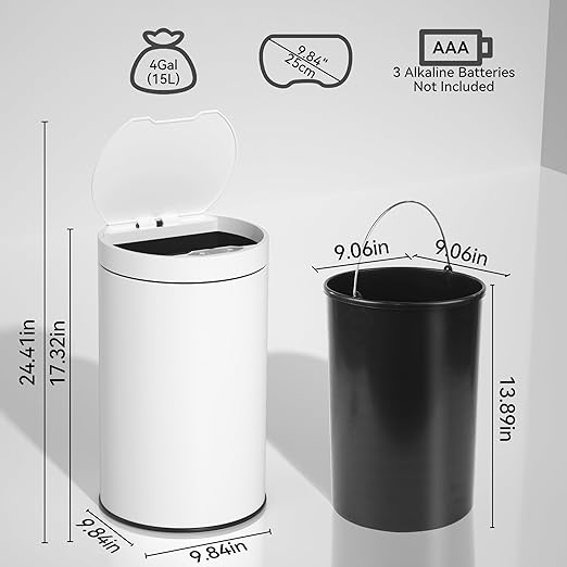 - BEAUTIFUL & PRACTICAL:The stainless steel trash can features a smooth surface, making it easy to clean. The round-shaped trash can can blend seamlessly with any decor style. The 4-gallon trash can not only effectively meets the daily life needs but is also highly suitable for small spaces such as kitchen, bathroom, office, living room, and bedroom