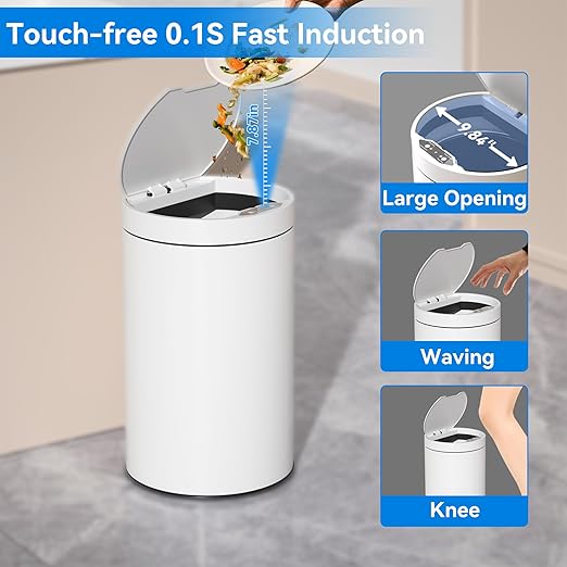- MOTION SENSOR TRASH CAN:Our bathroom trash can with lid adopts infrared sensor technology with a sensing distance of 7.87 in.Touchless trash can with 0.1 s quick response, convenience and clean, making your life easier
