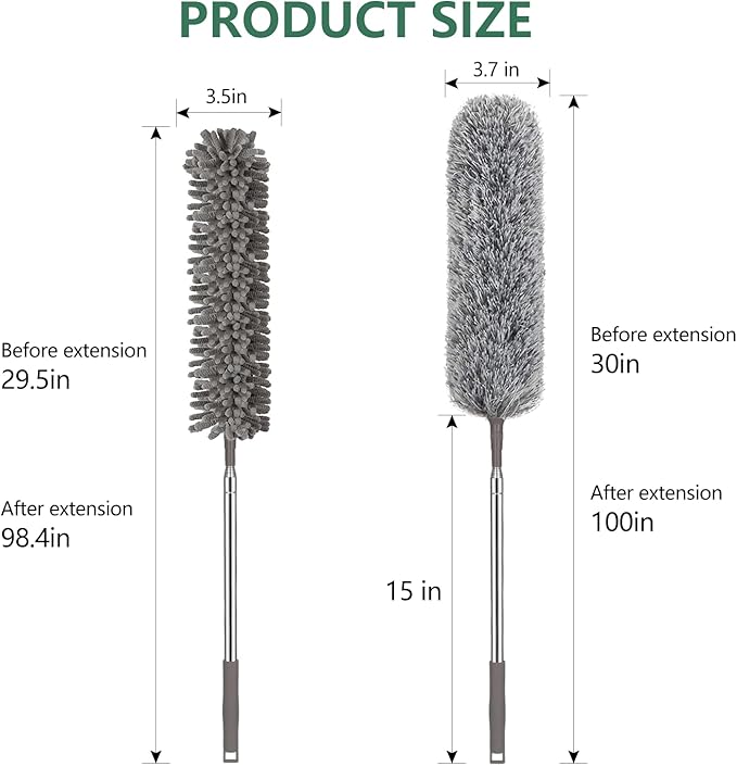 - EXTENDABLE DUSTER - This telescoping duster can be extended to 100". Extend the high duster to the length you need. For cleaning jobs of different heights, just this household cleaning tool is enough.