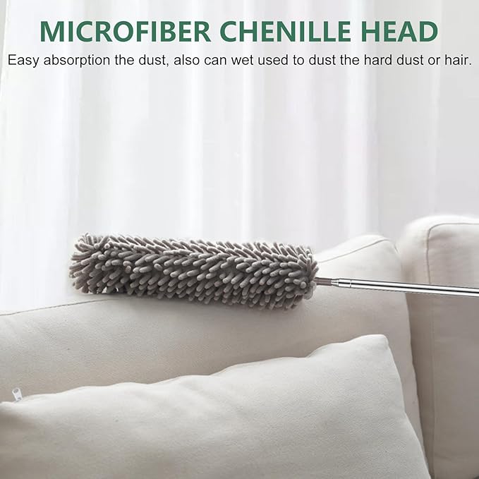 - BENDABLE MICROFIBER DUSTER - Includes stainless steel extension pole*1, microfiber duster head*1, chenille duster head*1. Bendable duster head can quickly capture and absorb fine dust and hair on the ceiling fan.