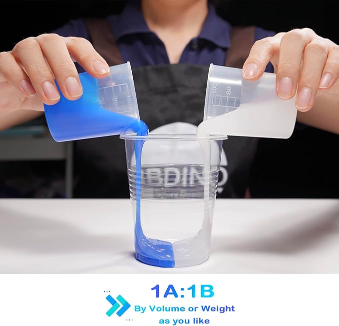 - 【MIX RATIO 1A:1B BY VOLUME or WEIGHT】This silicone mold making kit can be mixed 1A:1B either by Volume or by Weight. Beginner friendly pack of silicone mold making, it will comes with 2 bottles, each part 550g/19.4 Oz, together with a tool kit, you will receive 6 pcs of gloves, 3 pcs of wood mixing sticks, 1 premium edge trim, and a informative user manual;