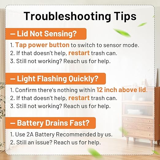 - ใCUSTOMER NOTICEใ The bathroom wastebasket requires two AA batteries (not included). Press and hold the switch to turn the power on/off. If the light flashes and the sensor does not work, you can try to turn off the power and restart the smart trash can.