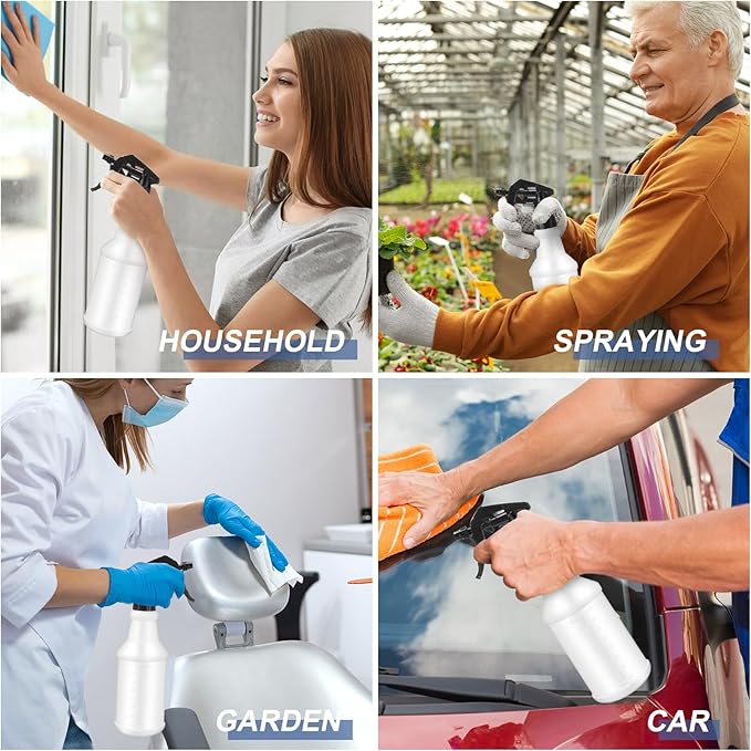 - Multifunctional Cleaning Bottles: our spray bottles are large capacity and dense spray, ideal for household, pet, car detailing, cleaning disinfecting, hairdressing, misting and watering plants, ironing, laundry, BBQ, and spraying the body, etc.; Homemade DIY spray bottle
