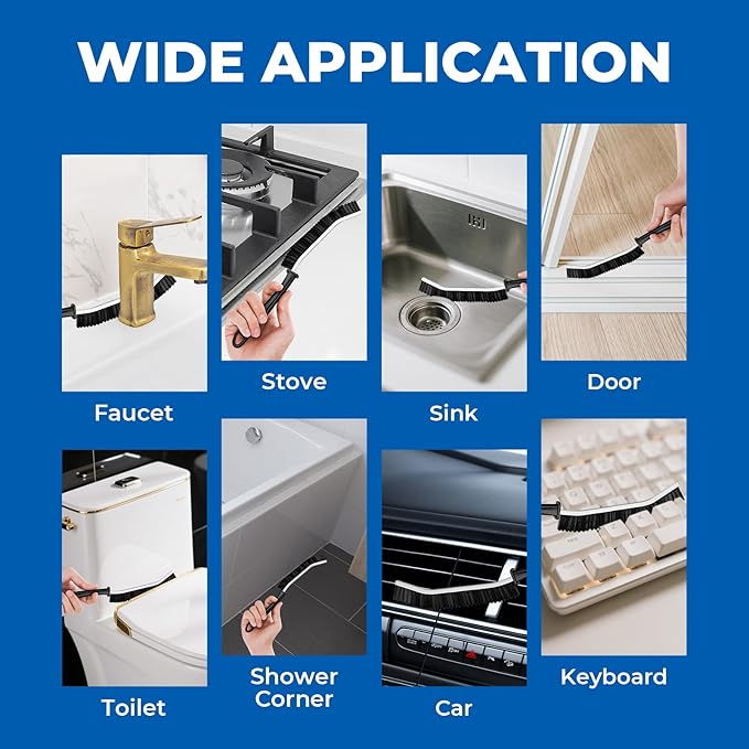 - Multi-purpose Brush: Crevice cleaning brushes for cleaning a variety of surfaces, including faucet and bathtub grout, shower door grooves, toilet seat gaps, floor tile grout, sliding glass door tracks, door rail grooves, around bathtub, kitchen sink edges, household appliance surfaces and crevices (microwave, coffee maker, oven, washing machine, fan), Window rails, shutters, stoves, keyboards, bathtubs, vents, swimming pools, vehicles, furniture, boats, countertops, shower door frames, toilet tank baseboards, etc.
