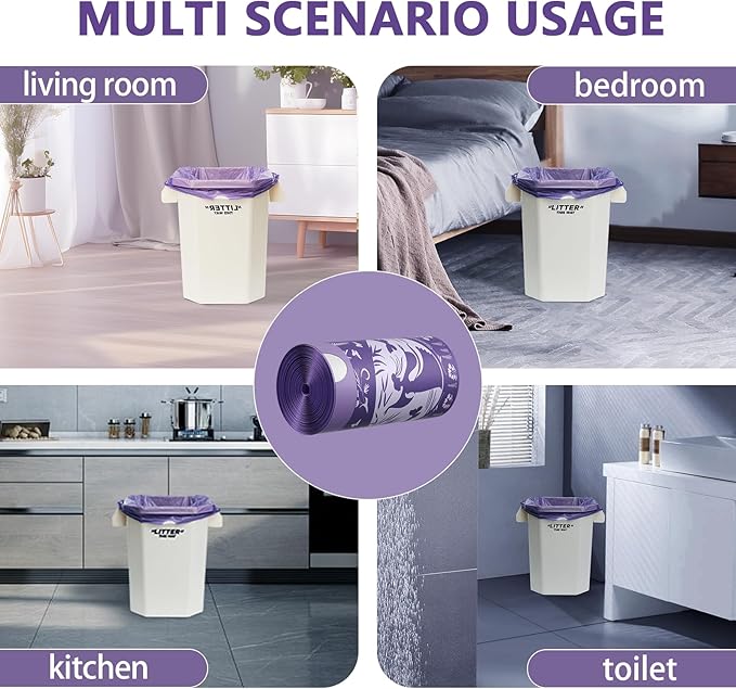 - 【Material and Smell】: All of our small garbage bags are made of HDPE material. This material can make the garbage bag stronger, we also added some lavender fragrance to the 8 gallon garbage bag, so the garbage bag will have a slight smell of lavender which can properly neutralize some of the garbage smell