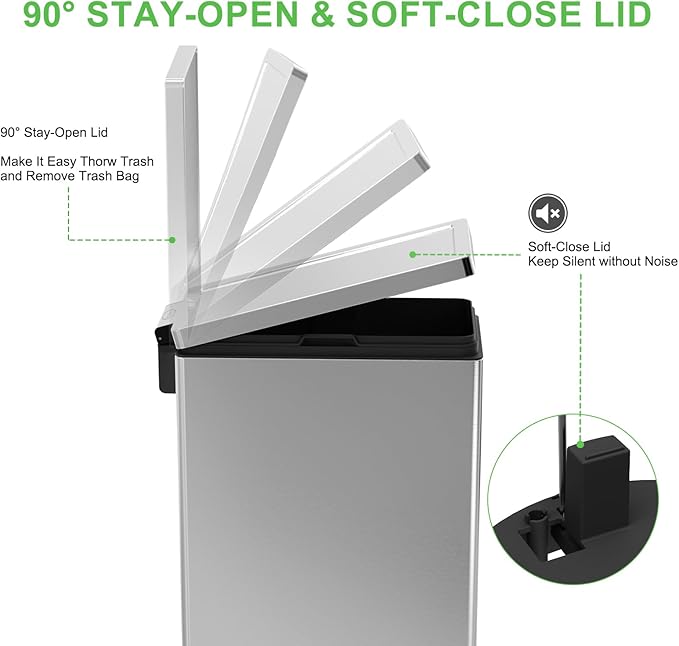 - DURABLE PEDALS - Upgraded stainless steel pedals replace traditional plastic pedals, durable enough to withstand 200,000 pedal strokes for over 30 years of service life, built-in release cushioning for gentle and quiet opening and closing of the lid.