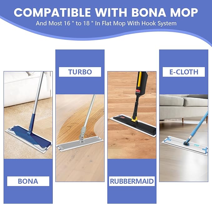 - ✅【Wide Compatibility & Perfect Fit】 Fits Bona, Rubbermaid, Turbo, Norwex Spray Mop, and all 15-18" flat mops with hook-and-loop systems. Specially designed 16.1” x 5.1” size ensures secure attachment, making it ideal for both household and commercial cleaning needs.