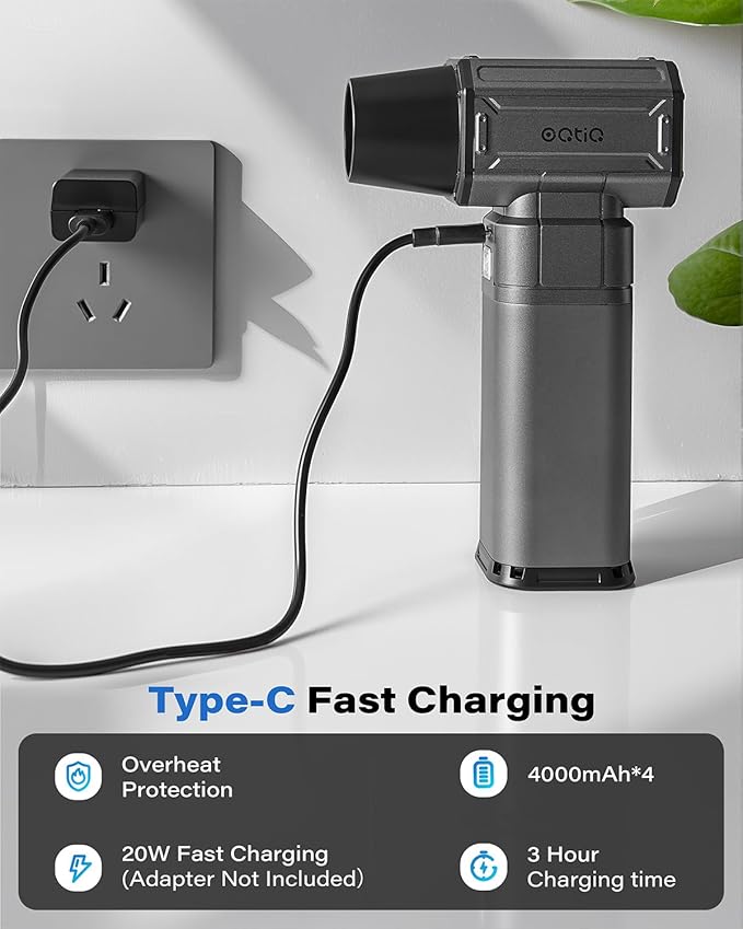 - Fast Charging & Long Runtime: The air duster built in 4000mAh*4 batteries, which can provide up to 100 minutes of runtime on the 1st gear and last up to 19 minutes longer in Turbo mode. Type-C fast charging, let you Keep cleaning without pause.