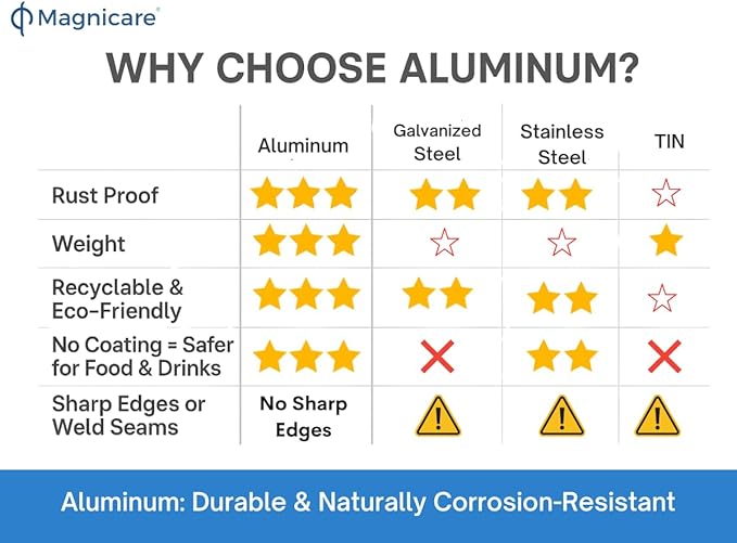 - Naturally Rust-Resistant and Food-Safe - Unlike galvanized steel, which can flake or corrode over time, aluminum resists rust naturally—without any coating required. The surface is non-toxic and safe for contact with ice, drinks, or fresh produce, making it ideal for food-related uses.