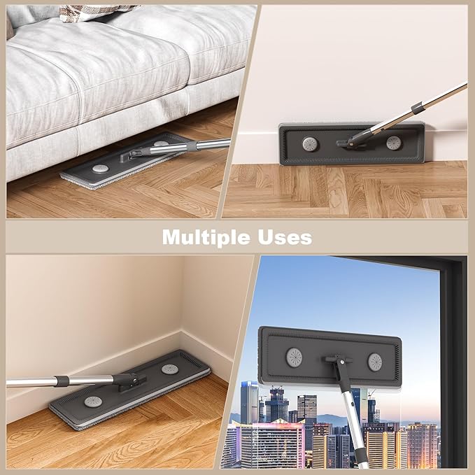 - REACH INTO : flat floor mop have 360°rotatable rectangular mop heads which makes it more suitable for cleaning corners and narrow spaces than triangular and round mops. Perfect for floor and window cleaning in home and office.