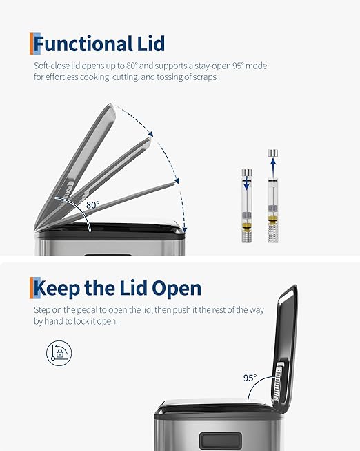 - [PRACTICAL DESIGN] – GarveeHome’s dual trash and recycling bins put ease of use first. Ergonomic side handles let you lift and relocate the entire unit effortlessly. The soft-close lid opens to 80° without collision with standard kitchen island edges, and locks at 95° for hands-free cooking prep and scrap disposal. Dual inner buckets with weighted-edge lids trap odors separately. A custom liner ring secures any standard bag snugly, eliminating slips, bunching, and overhang