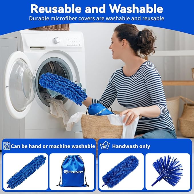 - 【Flexible, Washable & Detachable Dusters】: The ceiling fan duster is highly flexible, allowing it to bend at any angle to clean even the most hard-to-reach corners and areas. The long cobweb duster with an extension pole is made of flexible materials, ensuring that the ceiling fan cleaner is easy to use and reusable. To clean it, simply remove the head from the dust wand and wash it with warm water