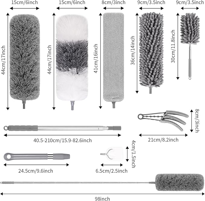 - 10PCS Dusters Cleaning Kit: Our dusters kit for cleaning includes: 2* microfiber dusters; 1* crevice brush; 1* chenille duster; 1* mini chenille hand duster; 1* window blind cleaner; 3*upgraded extension poles; 1* hook. This duster cleaning kit contains multiple heads great for cleaning hard-to-reach places with multiple cleaning accessories.