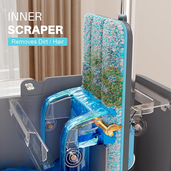 - [Mop Bucket Set] Flat squeeze mop bucket set. A self-cleaning mop reduces your time and labor, allowing the bucket to handle more than you can on your own. Mopping is simplified between the mop and bucket, keeping you away from dirty water; all you need to do is insert and pull the mop