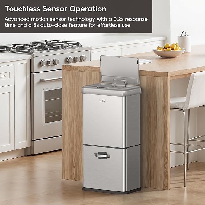 - Premium Motion Sensor Technology – Equipped with a lightning-fast 0.2-second sensor and whisper-quiet soft-close lid for a seamless user experience with this automatic trash can.
