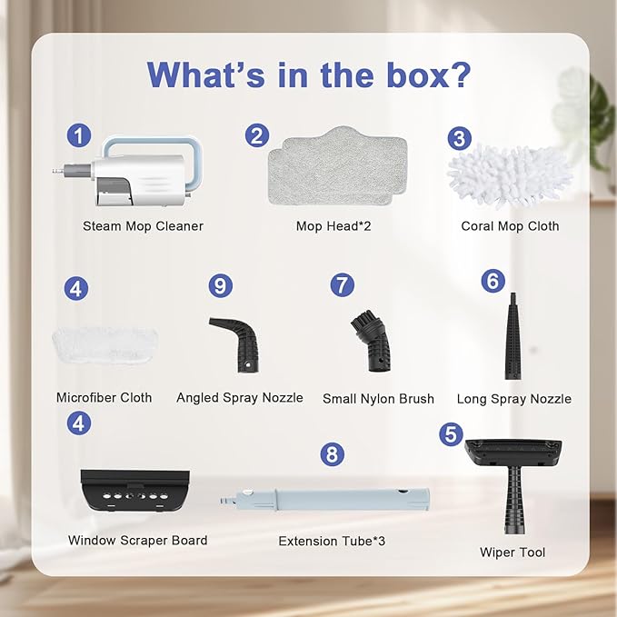 - 【Adjustable and Removable, Convenienct Steam Cleaner】 ✅Equipped with dual cleaning modes, you can choose different mode to fit your needs. The extended 23FT power cord and rotating steam mop cleaner head. With 180-degree horizontal and 135-degree vertical rotation, make cleaning corners and edges a breeze. The three-section detachable pole adjusts to different heights, ensuring a comfortable cleaning experience without any strain.