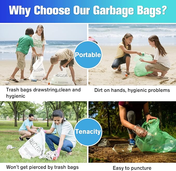 - Trash Bags Drawstring-Good Toughness & Leak-proof: Add garbage bags Sizes 10 gallon recycling bags to household cleaning supplies to tackle messes of all sizes. Designed with double side seals and a reinforced bottom to uniquely trap liquids and prevent leaks, and is strong enough to handle the heaviest load. Our small garbage bags are translucent, help easily view and separate recyclable from non-recyclable materials.