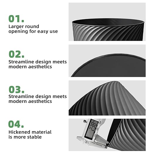 - đăSleek & Modern Curved Designă Upgrade your space with our stylish 1.8-gallon trash cans (3-pack), featuring a unique Curved look for a contemporary vibe. Perfect for bathrooms, bedrooms, offices, or kitchens, these bins blend seamlessly with any decor while offering durable, thickened PP plastic construction.