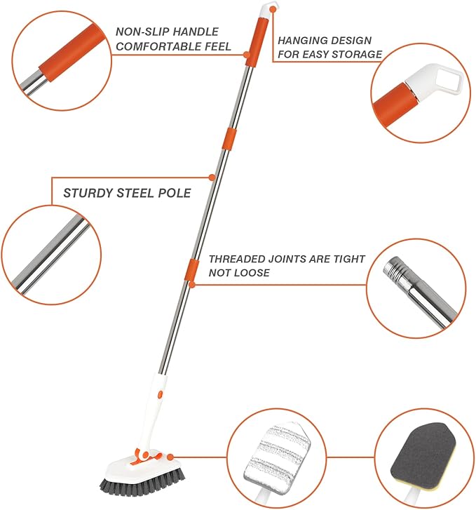 - 【Adjustable Long Handle】With an adjustable handle that extends from 21.7" to 51.2", this scrub brush lets you effortlessly clean hard-to-reach areas without bending, stretching, or squatting. Say goodbye to back pain and make your cleaning tasks easier and more efficient – perfect for every corner of your home!