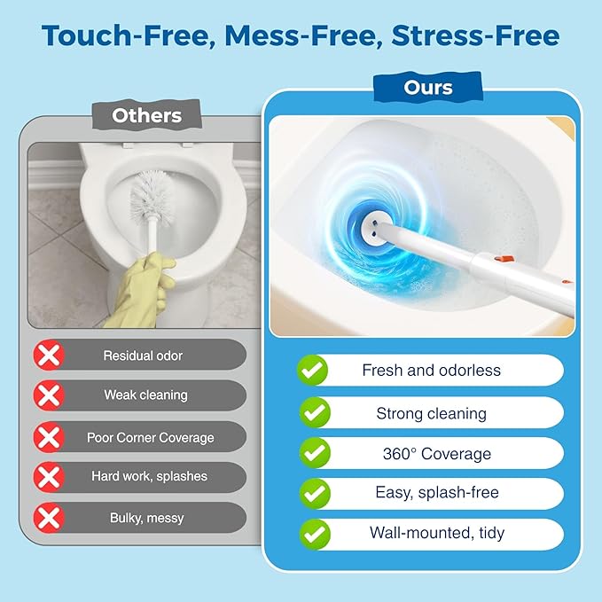- [One-Button Pop-Up Design: Hygienic & No Touch] No more touching dirty brush heads! Press one button to pop off used disposable heads directly into the trash, keeping your hands clean and hygienic. The set includes a wall-mounted holder that sticks firmly to smooth surfaces (tiles, glass, or bathroom walls) — it keeps the brush organized, saves counter space, and keeps your bathroom tidy. Perfect for small bathrooms, apartments, dorms, or rental homes.