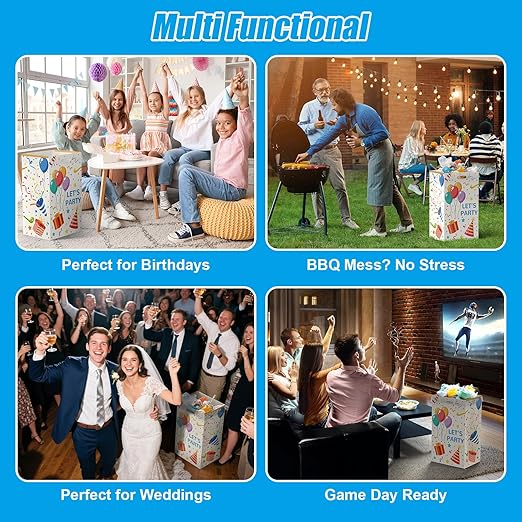 - EASY CLEANUP AFTER THE PARTY: Using this disposable trash can makes cleanup quick and effortless, eliminating the need for strenuous cleaning or extra tidying up. Perfect for birthdays, pool parties, barbecues, camping, picnics, corporate events, sports games, family gatherings, weddings, and more—it allows you to fully enjoy your time without worrying about trash disposal