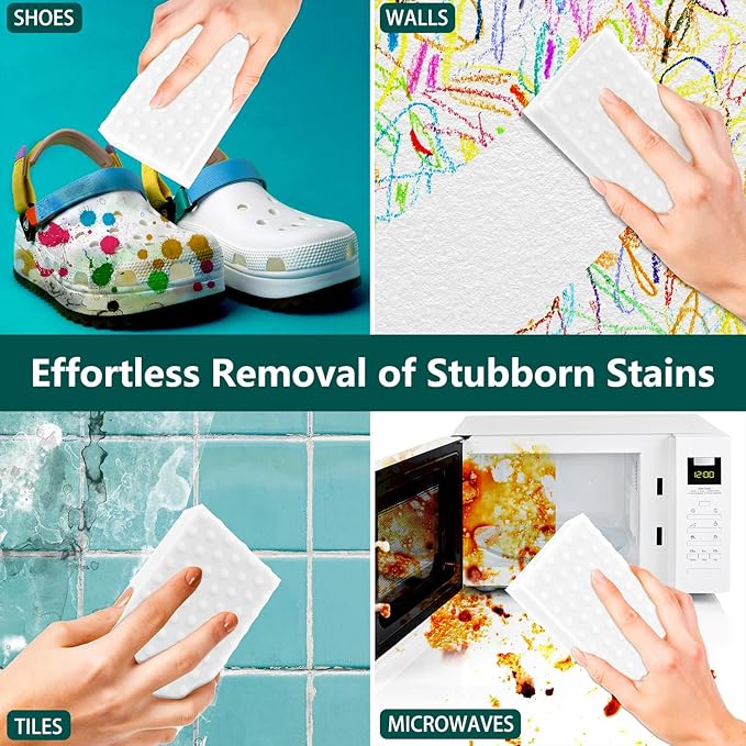 - Magic Sponge Erasers: Nano-manufacturing technology makes the magic sponge deeply absorb stubborn stains without scratching the surface, works like a charm on various surfaces, effortlessly removing stubborn stains and grime, scuff marks, soap scum, crayon marks from walls, etc