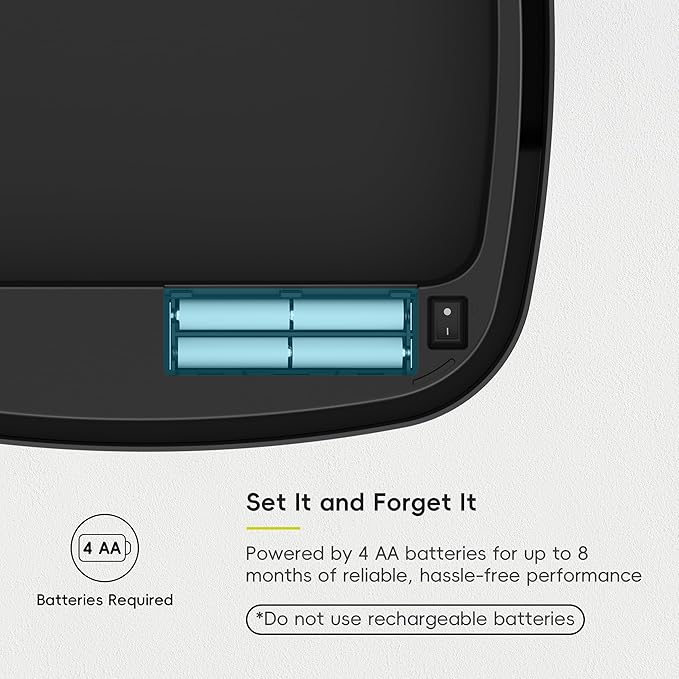 - Ultra Power Efficiency – Powered by 4 AA alkaline batteries, this automatic kitchen trash can runs for up to 8 months, combining energy efficiency with long-lasting performance.