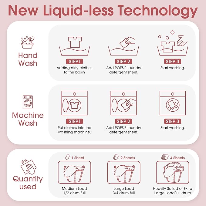 - Easy to Use - Liquidless detergent sheets, 1 sheet for small or medium loads where clothes are not very dirty, 2 sheets for large loads and 4 sheets for extra large loads, no waste. Not too little and not too much to save resources