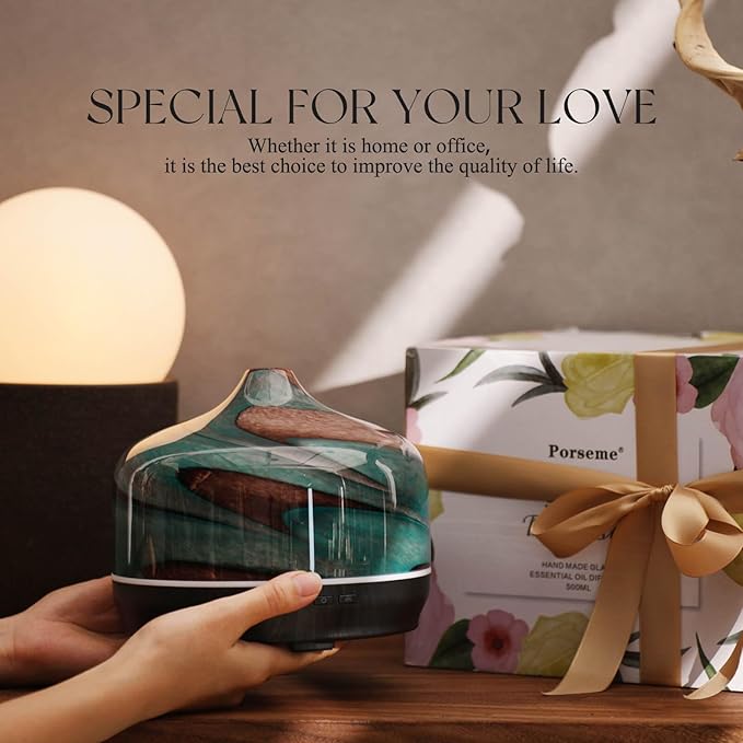 Porseme 500ml Glass Essential Oil Diffuser Aromatherapy Ultrasonic Cool Mist Humidifier 15-21 Running Hours Waterless Auto-Off Air Diffusers for Sleeping Yoga Office Working Spa and Rest (Teal Green)