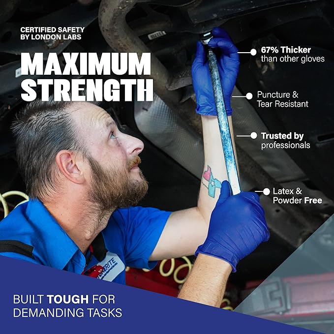 - Built Tough for Demanding Tasks: Crafted from premium 5 mil nitrile, these heavy duty nitrile gloves are 67% thicker than standard medical gloves & Disposable delivering enhanced strength, elasticity, and comfortable fit. The added thickness creates a secure barrier against punctures, abrasions and exposure to harsh chemicals like solvents, oils, and disinfectants. Unlike latex gloves, they won’t trigger allergies, and unlike vinyl gloves, they won’t tear or degrade under pressure.