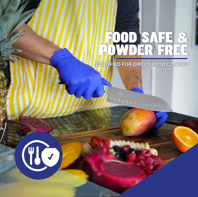 - Food Safe & Powder-Free: Certified for direct food contact, these food grade gloves disposable are latex free and powder free, making them ideal for food service, commercial kitchens, and home use. Whether you're cooking at home, working in a restaurant, or catering a BBQ, they’re perfect as food prep gloves, cooking gloves, disposable food safe, or kitchen gloves for food prep. Comfortable and durable, they stand up to raw ingredients, oils, and sauces without tearing or slipping.
