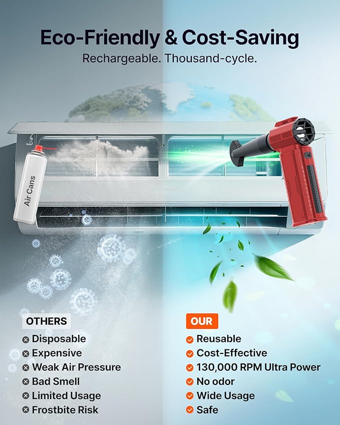 - [Cost-Effective & Reusable] The rechargeable electric air duster replaces 1,000+ disposable canned air. Only dry, stable airflow, shielding your devices from damage, blending eco-friendliness with high-tech precision.