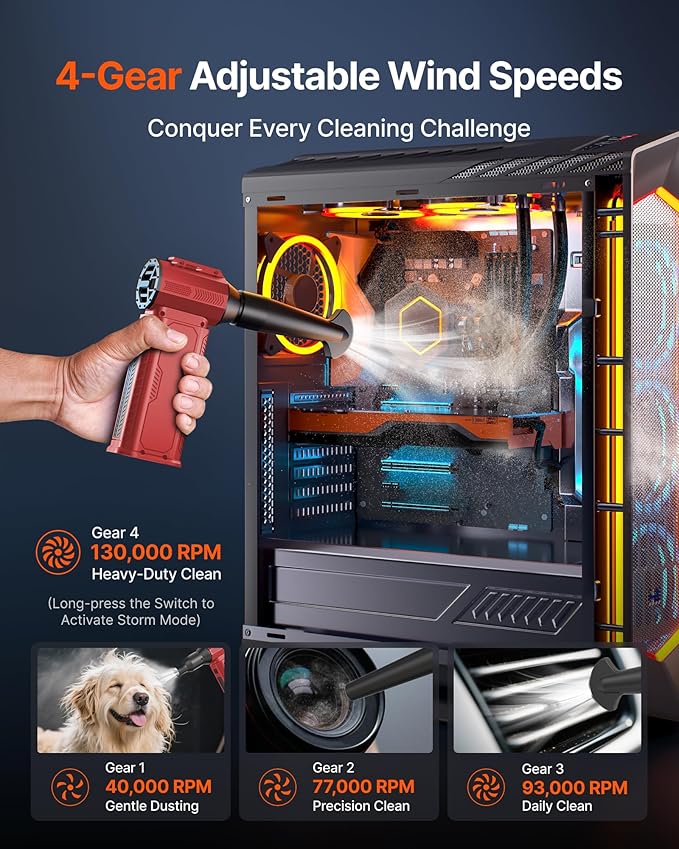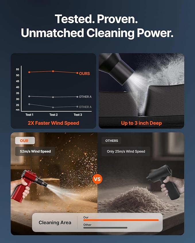 - [130K RPM Cleaning Storm] Our compressed air duster features a 2X ultra-powerful brushless motor, delivering 52 m/s airflow, to blast even 3-year dust from keyboards in 10 seconds.