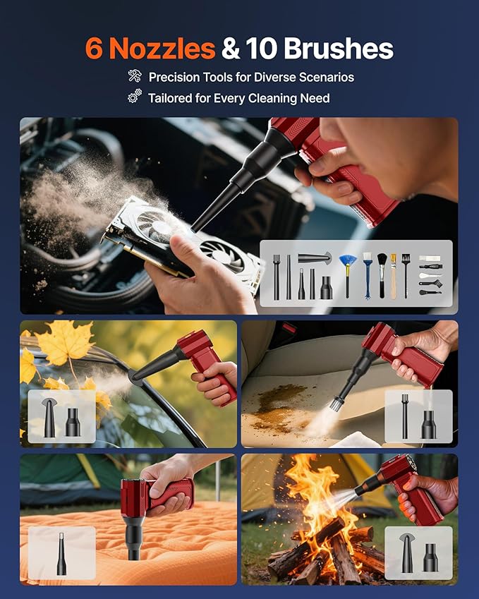 - [6 Versatile Nozzles & 10 Detail Brushes] Offer tailored solutions for every cleaning task, from delicate computer keyboards and sensitive electronics to car detailing, home deep cleans, and even outdoor inflation tasks. One tool, infinite mastery.