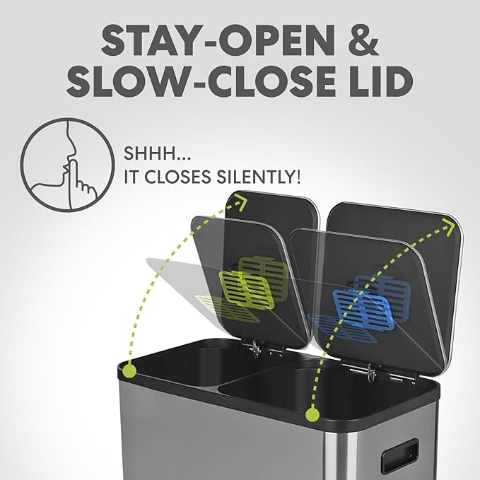- HANDS-FREE USE: The stainless-steel foot pedal stands up to daily use and removes the need to touch the lid during waste or recycling disposal to keep hands clean.